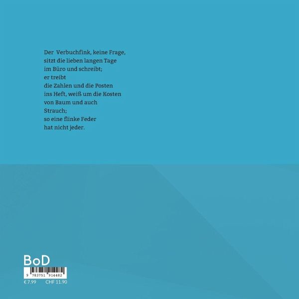 Der Verbuchfink, keine Frage,sitzt die lieben langen Tageim Büro und schreibt; er treibtdie Zahlen und die Postenins Heft, weiß um die Kostenvon Baum und auchStrauch;so eine flinke Federhat nicht jeder.