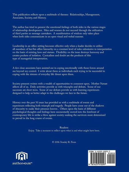 This publication reflects upon a multitude of themes: Relationships, Management, Associates, Society, and History. The author has tried to present the emotional feelings of both sides in the various stages Of relationship development. Men and women do not succeed through the utilization Of third parties as message caretakers. A manifestation of wisdom only takes place When both sides communicate in an open visual and verbal manner. Leadership in an office setting becomes effective only when a leader decides to utilize All members of her/his office hierarchy on a constant level of rules submissive to inter- Pretation on the basis of existing laws and statues. Flexibility on the issue destroys Harmony and creates pockets of isolation. Cynicalism and doubt are the products of this Type of managerial interpretation. A few close associates have assisted me in coping emotionally with those forces around Me beyond my control. I write about them as individuals each trying to be successful in Coping with the stresses of everyday life thrust upon them. Society presents writers with a wealth of opportunities to comment upon. Mother Nature Affects all of us. Daily activities provide us with triumphs and defeats. Some of our Successes are short term. Some of our defeats provide us with learning experiences Designed to help us better adapt to the challenges we face in the future. History over the past 50 years has provided us with a multitude of events and Experiences reflecting both triumph and tragedy. People have come out of the shadows Of obscurity to make their presence known . Others upon the basis of different psycho- Logical thoughts and feelings have momentarily moved into the forefront of contem- Porary life to strike a blow against society making the survivors more determined to Prevail in the long course of events. Readers: Enjoy. TAKE A MOMENT TO REFLECT UPON WHAT IS AND WHAT MIGHT HAVE BEEN.