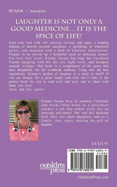 Facebook has given me a stage. A daily, worldwide audience for me to entertain with my humor. This book is a compilation of 4 years of amusing postings that I have written on my Facebook page, hoping to entertain my friends and family. Laughter is not only good medicine, it is also food for the soul. Like a good meal, humor is served up in the hopes that the diner will not only savor the flavor, but be filled to the brim with that 'fat and happy' feeling. This is my heart's desire! To bring a smile to everyone that I have contact with and this book was written with this in mind. My job as an in-home preschool teacher provides me with the company of some of the funniest people on the planet. Children! It's true they say the darndest things and many of these little gems are included in the "Daycare Dandies" section of the book. They have always been a big hit with my readers! After indulging in 300 Amusing Musings (That's right! 300! I counted!) you are treated to a heaping helping of non-fat whimsical poetry, a dash of juvenile anecdotes, and a side of deadpan comedic writings! So go ahead and fill up with zero calories of laughter and remember to "Live, Love, Laugh... a Lot!" Salute and Bon Appetite!