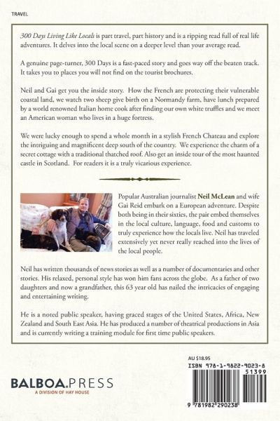 300 Days Living Like Locals is part travel, part history and is a ripping read full of real life adventures. It delves into the local scene on a deeper level than your average read. A genuine page-turner, 300 Days is a fast-paced story and goes way off the beaten track. It takes you to places you will not find on the tourist brochures. Neil and Gai get you the inside story. How the French are protecting their vulnerable coastal land, we watch two sheep give birth on a Normandy farm, have lunch prepared by a world renowned Italian home cook after finding our own white truffles and we meet an American woman who lives in a huge fortress. We were lucky enough to spend a whole month in a stylish French Chateau and explore the intriguing and magnificent deep south of the country. We experience the charm of a secret cottage with a traditional thatched roof. Also get an inside tour of the most haunted castle in Scotland. For readers it is a truly vicarious experience.
