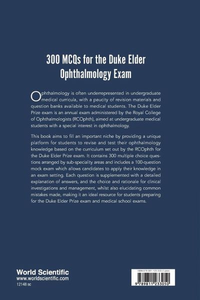This book contains 300 multiple choice questions (MCQs), in the format of a single best answer (SBA) from four options, for undergraduate medical students preparing for the Duke Elder prize exam run by the Royal College of Ophthalmologists (RCOphth) annually. The content is organised in line with topics drawn from the candidate information pack provided by the RCOphth. Each question is supplemented with a detailed explanation of the right answer as well as explanations for the alternative answers, elucidating common mistakes made by students. These explanations are supplemented with schematic diagrams which greatly aid understanding. There are 8 chapters focusing on topics outlined in the Duke Elder exam, each containing a set of 25 questions and answers. This allows us to cover the most commonly seen topics appearing in the exam. The book will also provide a full mock assessment which will offer a unique opportunity for candidates to apply their knowledge in an exam context. The exam format is such that candidates must complete 90 MCQs in the space of 2 hours. Our mock will provide candidates with a 100 MCQ mock to be completed in the space of 2 hours 15 minutes.