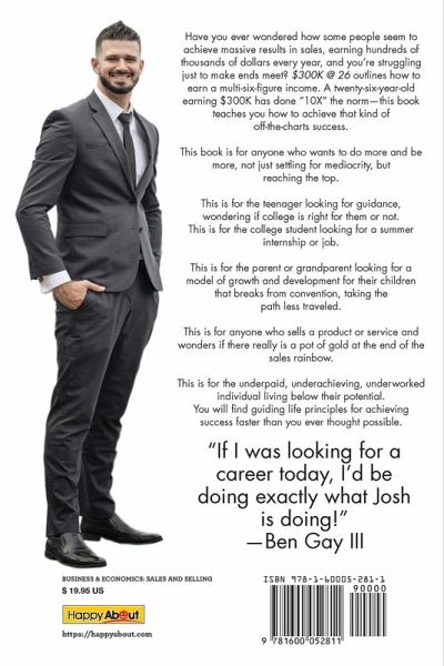 Have you ever wondered how some people seem to achieve massive results in sales, earning hundreds of thousands of dollars every year, and you're struggling just to make ends meet? $300K @ 26 outlines how to earn a multi-six-figure income. A twenty-six-year-old earning $300K has done "10X" the norm-this book teaches you how to achieve that kind of off-the-charts success. This book is for anyone who wants to do more and be more, not just settling for mediocrity, but reaching the top. This is for the teenager looking for guidance, wondering if college is right for them or not. This is for the college student looking for a summer internship or job. This is for the parent or grandparent looking for a model of growth and development for their children that breaks from convention, taking the path less traveled. This is for anyone who sells a product or service and wonders if there really is a pot of gold at the end of the sales rainbow. This is for the underpaid, underachieving, underworked individual living below their potential. You will find guiding life principles for achieving success faster than you ever thought possible.