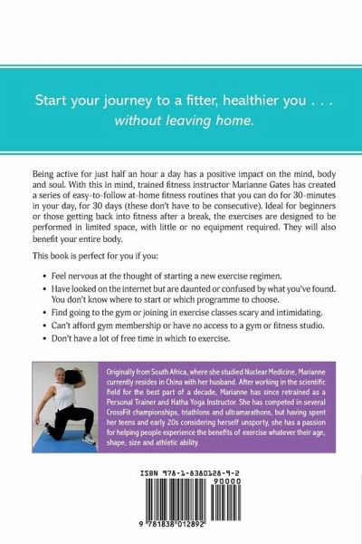Start your journey to a fitter, healthier you . . . without leaving home. Being active for just half an hour a day has a positive impact on the mind, body and soul. With this in mind, trained fitness instructor Marianne Gates has created a series of easy-to-follow at-home fitness routines that you can do for 30-minutes in your day, for 30 days (these don't have to be consecutive). Ideal for beginners or those getting back into fitness after a break, the exercises are designed to be performed in limited space, with little or no equipment required. They will also benefit your entire body. This book is perfect for you if you: · Feel nervous at the thought of starting a new exercise regimen. · Have looked on the internet but are daunted or confused by what you've found. You don't know where to start or which programme to choose. · Find going to the gym or joining in exercise classes scary and intimidating. · Can't afford gym membership or have no access to a gym or fitness studio. · Don't have a lot of free time in which to exercise.