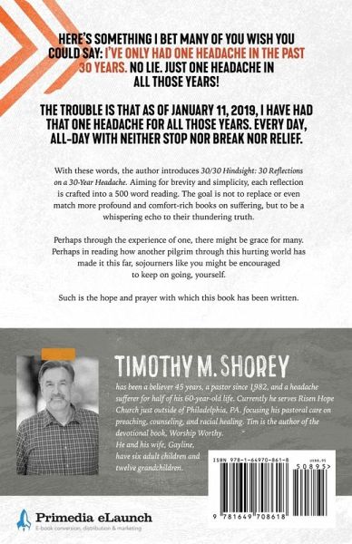 Here's something I bet many of you wish you could say: I've only had one headache in the past 30 years. No lie. Just one headache in all those years! The trouble is that as of January 11, 2019, I have had that one headache for all those years. Every day, all-day with neither stop nor break nor relief. With these words, the author introduces 30/30 Hindsight: 30 Reflections on a 30-Year Headache. Aiming for brevity and simplicity, each reflection is crafted into a 500 word reading. The goal is not to replace or even match more profound and comfort-rich books on suffering, but to be a whispering echo to their thundering truth. Perhaps through the experience of one, there might be grace for many. Perhaps in reading how another pilgrim through this hurting world has made it this far, sojourners like you might be encouraged to keep on going, yourself. Such is the hope and prayer with which this book has been written.