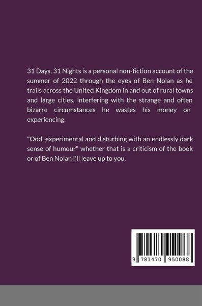 31 Days, 31 Nights is a strange, odd and acid-trip style journalistic retelling of the summer of 2022 through the often half-open, dead and sleep deprived eyes of Ben Nolan, a dangerously inexperienced and unprofessional writer, in fact so unprofessional and inexperienced he's talking about himself in the third person on his own blurb. Turbulent and Insane in tone, 31 Days and 31 Nights has been described by some as 'eye-opening, interesting and mind expanding' and by others as 'insulting to the intelligence, odd and nothing you couldn't get from a shorter, cheaper trip on that gone off bottle of cough medicine at the back of your medicine cabinet'. So just experiment and see what you think I guess. -Third Person Ben Nolan