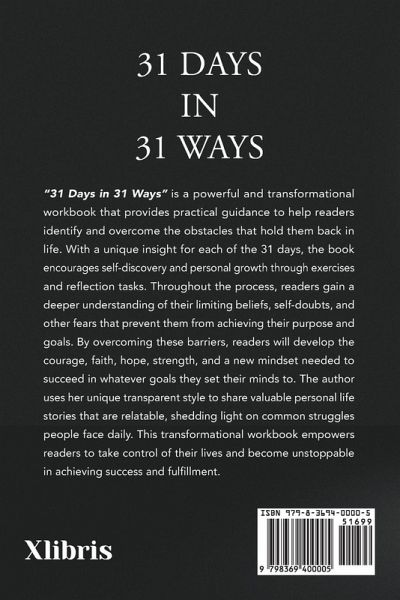 "31 Days in 31 Ways" is a powerful and transformational workbook that provides practical guidance to help readers identify and overcome the obstacles that hold them back in life. With a unique insight for each of the 31 days, the book encourages self-discovery and personal growth through exercises and reflection tasks. Throughout the process, readers gain a deeper understanding of their limiting beliefs, self-doubts, and other fears that prevent them from achieving their purpose and goals. By overcoming these barriers, readers will develop the courage, faith, hope, strength, and a new mindset needed to succeed in whatever goals they set their minds to. The author uses her unique transparent style to share valuable personal life stories that are relatable, shedding light on common struggles people face daily. This transformational workbook empowers readers to take control of their lives and become unstoppable in achieving success and fulfillment.