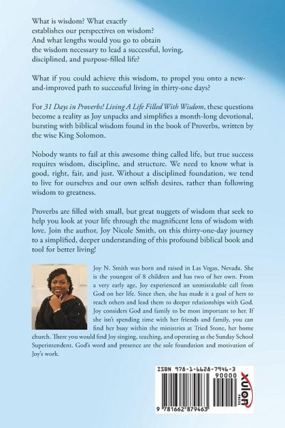 What is wisdom? What exactly establishes our perspectives on wisdom? And what lengths would you go to obtain the wisdom necessary to lead a successful, loving, disciplined, and purpose-filled life? What if you could achieve this wisdom, to propel you onto a new-and-improved path to successful living in thirty-one days? For 31 Days in Proverbs! Living A Life Filled With Wisdom, these questions become a reality as Joy unpacks and simplifies a month-long devotional, bursting with biblical wisdom found in the book of Proverbs, written by the wise King Solomon. Nobody wants to fail at this awesome thing called life, but true success requires wisdom, discipline, and structure. We need to know what is good, right, fair, and just. Without a disciplined foundation, we tend to live for ourselves and our own selfish desires, rather than following wisdom to greatness. Proverbs are filled with small, but great nuggets of wisdom that seek to help you look at your life through the magnificent lens of wisdom with love. Join the author, Joy Nicole Smith, on this thirty-one-day journey to a simplified, deeper understanding of this profound biblical book and tool for better living! Joy N. Smith was born and raised in Las Vegas, Nevada. She is the youngest of 8 children and has two of her own. From a very early age, Joy experienced an unmistakable call from God on her life. Since then, she has made it a goal of hers to reach others and lead them to deeper relationships with God. Joy considers God and family to be most important to her. If she isn't spending time with her friends and family, you can find her busy within the ministries at Tried Stone, her home church. There you would find Joy singing, teaching, and operating as the Sunday School Superintendent. God's word and presence are the sole foundation and motivation of Joy's work.