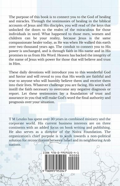 The purpose of this book is to connect you to the God of healing and miracles. Through the testimonies of healing in the biblical accounts of Jesus and His disciples, you will read of the keys that unlocked the doors to the realm of the miraculous for those individuals in need. What happened to those men, women and children can be your reality, because Jesus is the same compassionate healer today, as He was when He walked this earth over two thousand years ago. The conduit to connect you to His power is unchanged, and is through faith in His name and in His promises to us from His Word. Heaven has backed the integrity of the name of Jesus with power for those that will believe and trust in Him. These daily devotions will introduce you to this wonderful God and Savior and will reveal to you that His words are faithful and true to anyone who will humbly believe them and receive them into their lives. Whatever challenge you are facing, His words will instill the faith necessary to overcome any negative diagnosis or report. Let these testimonies lay a foundation of trust and assurance in you that will make God's word the final authority and prognosis over your situation.