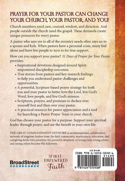 Prayer for your pastor can change your church, your pastor, and you! Church members need care, counsel, wisdom, and direction. And people outside the church need the gospel. These demands create unique pressures for every pastor. A pastor who says yes to all of the ministry needs often says no to a spouse and kids. When pastors have a personal crisis, many pastors may feel alone and have few people to turn to for true support. How can you support your pastor? 31 Days of Prayer for Your Pastor provides: * Inspirational devotions designed around Spirit-empowered discipleship outcomes. * True stories from pastors and key research findings to help you understand pastor challenges and opportunities. * A powerful, Scripture-based prayer strategy for both you and your pastor to better love the Lord, live God's Word, love people, and live God's mission. * Scriptures, prayers, and promises to declare over yourself first and then for your pastor. * A practical resource for pastor appreciation and a tool for launching a Pastor Prayer Team in your church. God has chosen your pastor for a purpose. Support your spiritual leader through prayer, and see the benefit in your own life.
