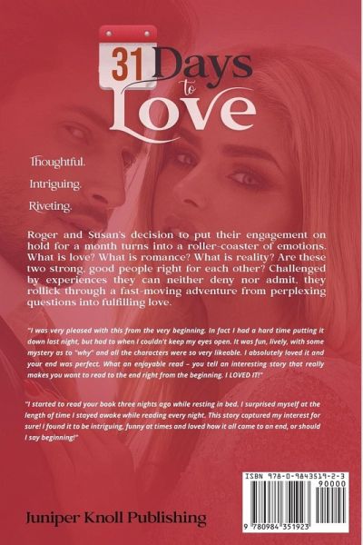 31 Days to Love is a thoughtful, intriguing, riveting romance that explores what "romance" really is. Roger and Susan put their engagement on pause for 31 days to find out if what they feel is romance or love or something else.