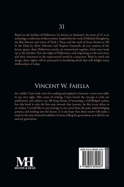 Based on the holiday of Halloween (or known as Samhain), the story of 31 is an anthology, a collection of short stories. Inspired by the work of Michael Dougherty, the film director and writer of Trick r' Treat, and the work of Scary Stories to Tell in the Dark by Alvin Schwartz and Stephen Gammell, all true masters of the horror genre, these Halloween stories are intertwined together. Each story leads up to the October 31st, the night of Halloween, each impacting on the next story and their characters in the supernatural world in a sequence. Both in word and image, these nights will be portrayed in horrifying detail that will delight many thrill-seekers of today.