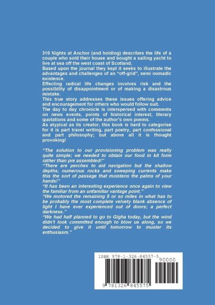 310 Nights at Anchor (and holding) describes the life of a couple who sold their house and bought a sailing yacht to live at sea off the west coast of Scotland. Based upon the journal they kept it seeks to illustrate the advantages and challenges of an "off-grid", semi nomadic existence. Effecting radical life changes involves risk and the possibility of disappointment or of making a disastrous mistake. This true story addresses these issues offering advice and encouragement for others who would follow suit. The day to day chronicle is interspersed with comments on news events, points of historical interest, literary quotations and some of the author's own poems. As atypical as its creator, this book is hard to categorise for it is part travel writing, part poetry, part confessional and part philosophy; but above all it is thought provoking!