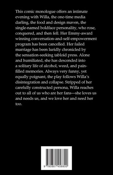 This comic monologue offers an intimate evening with Willa, the one-time media darling, the food and design maven, the single-named boldface personality, who rose, conquered, and then fell. Her Emmy-award winning conversation-and-self-empowerment program has been cancelled. Her failed marriage has been luridly chronicled by the sensation-seeking tabloid press. Alone and humiliated, she has descended into a solitary life of alcohol, weed, and pain-filled memories. Always very funny, yet equally poignant, the play follows Willa's disintegration and collapse. Stripped of her carefully constructed persona, Willa reaches out to all of us who are her fans-she loves us and needs us, and we love her and need her too.