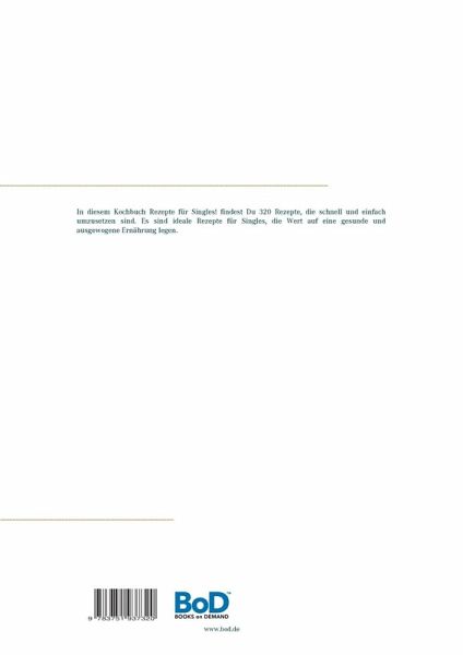 In diesem Kochbuch Rezepte für Singles! findest Du 320 Rezepte, die schnell und einfach umzusetzen sind. Es sind ideale Rezepte für Singles, die Wert auf eine gesunde und ausgewogene Ernährung legen.
