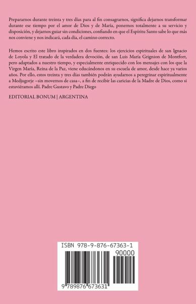 Prepararnos durante treinta y tres días para al fin consagrarnos, significa dejarnos transformar durante ese tiempo por el amor de Dios y de María, ponernos totalmente a su servicio y disposición, y dejarnos guiar sin condiciones, confiando en que el Espíritu Santo sabe lo que más nos conviene y nos indicará, cada día, el camino correcto. Hemos escrito este libro inspirados en dos fuentes: los ejercicios espirituales de san Ignacio de Loyola y El tratado de la verdadera devoción, de san Luis María Grignion de Montfort, pero adaptados a nuestro tiempo, y especialmente enriquecido con los mensajes con los que la Virgen María, Reina de la Paz, viene educándonos en su escuela de amor, desde hace ya varios años. Por ello, estos treinta y tres días también podrán ayudarnos a peregrinar espiritualmente a Medjugorje -sin movernos de casa-, a fin de recibir las caricias de la Madre de Dios, como si estuviéramos allí. Padre Gustavo y Padre Diego EDITORIAL BONUM ARGENTINA Este libro contiene el desarrollo de los siguientes temas, entre otros:¿Qué es consagrarse y consagrar? Frutos que surgirán de este libro Liberación de fuerzas malignas María nos abraza con amor Envueltos por la luz Protegidos por María Andar en Victoria Con este libro usted podrá conocer sobre el poder de la intercesión de La Virgen María. ¡Adquiera ya este libro y benefíciese con esta guía espiritual! TAGS: catolicismo; cristianismo; oraciones cristianas; virgen maría; santo rosario; consagrarse; fuerzas malignas