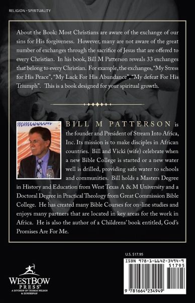 Most Christians are aware of the exchange of our sins for His forgiveness. However, many are not aware of the great number of exchanges through the sacrifice of Jesus that are offered to every Christian. In his book, Bill M Patterson reveals 33 exchanges that belong to every Christian. For example, the exchanges, "My Stress for His Peace", "My Lack For His Abundance", "My defeat For His Triumph". This is a book designed for your spiritual growth.