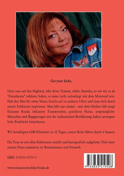 Get your kicks, fahre raus auf den Highway, lebe deine Träume, erlebe Amerika, so wie wir es als "Greenhorns" erfahren haben, es muss nicht unbedingt mit dem Motorrad sein. Hab den Mut für etwas Neues, breche auf zu anderen Ufern und lasse dich durch unsere Erlebnisse inspirieren. Man lebt nur einmal - und aktiv bleiben hält jung! Einsame Roads, bekannte Traumrouten, grandiose Natur, ursprüngliche Menschen und Begegnungen mit der indianischen Bevölkerung haben unvergessliche Eindrücke hinterlassen. Wir bewältigten 6280 Kilometer in 33 Tagen, unsere Reise führte durch 6 Staaten. Die Tour ist mit allen Erlebnissen erzählt und kartografisch aufgelistet. Viele interessante Fotos animieren zu Reiseträumen und Fernweh.