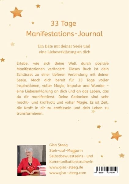 Erlebe, wie sich deine Welt durch positive Manifestationen verändert. Dieses Buch ist dein Schlüssel zu einer tieferen Verbindung mit deiner Seele. Mach dich bereit für 33 Tage voller Inspirationen, voller Magie, Impulse und Wunder - eine Liebeserklärung an dich und an das Leben, das du dir manifestierst. Deine Gedanken sind sehr macht- und kraftvoll und voller Magie. Es ist Zeit, die Kraft in dir zu entfesseln und dein Leben zu transformieren.Deine Gedanken sind sehr macht- und kraftvoll und voller Magie. Es ist Zeit, die Kraft in dir zu entfesseln und dein Leben zu transformieren.Dieses 33 Tage Power-Manifestations-Journal soll dich bei deiner täglichen Manifestationsroutine unterstützen und dich anleiten, Glück, Fülle, Liebe und den Reichtum in dein Leben zu ziehen, den du dir wünscht.In diesen 33 Tage entdeckst du eine transformative Reise zu innerer Stärke, Erfolg und persönlicher Entwicklung. Dieses Buch bietet nicht nur die Werkzeuge und Anleitungen für effektives Journaling, sondern auch 33 inspirierende Coaching- und Tagesimpulse, die dich täglich begleiten und deine Reise bereichern. Von Dankbarkeit und Selbstmotivation bis hin zu Achtsamkeit und Veränderung - diese Power-Impulse öffnen die Türen zu deinem selbstbewussteren und erfüllteren Leben. Lass dich von deinem Journal auf eine Reise mitnehmen, die dich zu deinem wahren Potenzial führt. Bist du bereit für eine 33-tägige Transformation? Dann starte jetzt und gestalte dein Leben nach deinen Wünschen!Denn jedes Buch, jedes Projekt und jeder Erfolg beginnt mit dem ersten Gedanken und dem festen Glauben an sich selbst. Öffne dich für die Impulse deiner Seele. www.gisa-steeg.comwww.gisa-steeg.de#WieausWundenWunderwerdenDenn jedes Buch, jedes Projekt und jeder Erfolg beginnt mit dem ersten Gedanken und dem festen Glauben an sich selbst.