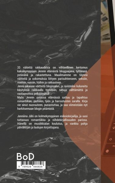 33 väitettä rakkaudesta on viihteellinen kertomus kaksikymppisen Jennin elämästä bloggaajana, tyttärenä, ystävänä ja rakastettuna. Maailmamme on täynnä väitteitä ja uskomuksia liittyen parisuhteeseen, seksiin, miehiin, naisiin, häihin ja rakkauteen. Jenni oikaisee väitteitä blogissaan, ja ravistelee kuluneita käsityksiä raikkaalla tyylillään, tabuja välttämättä ja vastaanottoa pelkäämättä. Myös Jennin omassa elämässä sattuu ja tapahtuu romantiikan, perheen, työn ja harrastusten saralla. Kirja vie sinut nuoruuteen, punastuttaa, ja saa viimeistään nyt harkitsemaan blogin pitämistä.