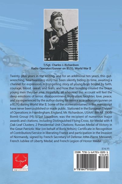 Twenty-plus years in the writing, and for an additional ten years, this gut-wrenching, heartwarming story has been silently biding its time, awaiting a channel for expression. A compelling story of young boys bound by faith, courage, blood, sweat, and tears, and how that bonding created the brave young men they became. Hopefully, all who read this account will feel the deep emotions of terror, disappointment, frustration, laughter, love, peace, and joy experienced by the author during his service as a radioman/gunner on a B17G during World War II. Some of the stories contained in this manuscript have never been published or made public. Stationed in the European Theater of Operations in Framlingham, England, Mr. Richardson, USAAF, 8th AF, 390th Bomb Group (H), 571st Squadron, was the recipient of numerous major awards and citations, including Distinguished Flying Cross; Air Medal with 4 Oak-Leaf Clusters; 2 Presidential Unit Citations; Russian Medal of Victory in the Great Patriotic War (on behalf of Boris Yeltsin); Certificate in Recognition of Contribution/Service in liberating France and participation in the Invasion of Normandy, signed by French Secretary of Defense John-Pierre Messeret; French Jubilee of Liberty Medal; and French Legion of Honor Medal.