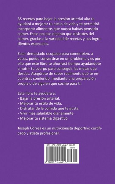 35 recetas para bajar la presión arterial alta te ayudará a mejorar tu estilo de vida y te permitirá incorporar alimentos que nunca habías pensado comer. Estas recetas dejarán que disfrutes del comer, gracias a la variedad de recetas y sus ingredientes especiales. Estar demasiado ocupado para comer bien, a veces, puede convertirse en un problema y es por ello que este libro te ahorrará tiempo ayudándote a nutrir tu cuerpo para conseguir las metas que deseas. Asegúrate de saber realmente qué te encuentras comiendo, mediante una preparación propia o de alguien que cocine para ti. Este libro te ayudará a: - Bajar la presión arterial. - Mejorar tu estilo de vida. - Disfrutar de la comida que te gusta. - Vivir más saludable diariamente. - Mejorar tu sistema digestivo. ¿Qué es la hipertensión arterial? La presión arterial consiste en la presión de la sangre sobre las paredes de las arterias. En circunstancias normales la presión arterial se eleva y cae durante todo el día. Sin embargo, cuando se mantiene elevada en el tiempo, se llama presión arterial alta. El término médico para esta afección se denomina Hipertensión. Una presión arterial alta de 140/90 mmHg ya encaja con hipertensión, mientras que entre 120/80 mmHG y 139/89 mmHg es una alarma de que a futuro puede alcanzarse la hipertensión, si es que no se toman medidas. Existen factores de riesgo que no se pueden controlar, como la edad (hombres mayores de 55 y mujeres mayores de 65) o un historial de afecciones cardíacas tempranas. Si puede controlarse en una presión arterial elevada: diabetes, peso, actividad física, colesterol, tabaquismo, o lo que llamamos estilo de vida.