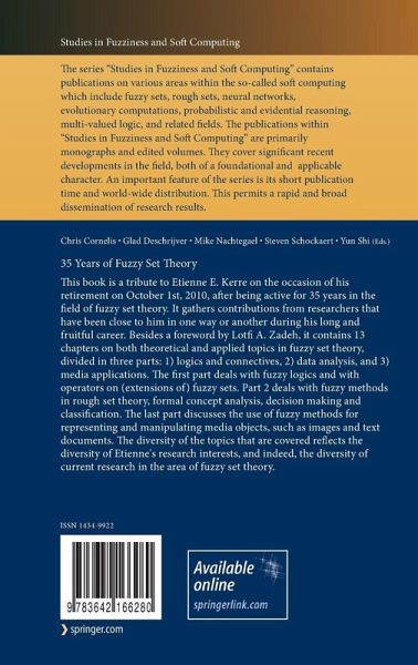 This book is a tribute to Etienne E. Kerre on the occasion of his retirement on October 1st, 2010, after being active for 35 years in the field of fuzzy set theory. It gathers contributions from researchers that have been close to him in one way or another during his long and fruitful career. Besides a foreword by Lotfi A. Zadeh, it contains 13 chapters on both theoretical and applied topics in fuzzy set theory, divided in three parts: 1) logics and connectives, 2) data analysis, and 3) media applications. The first part deals with fuzzy logics and with operators on (extensions of) fuzzy sets. Part 2 deals with fuzzy methods in rough set theory, formal concept analysis, decision making and classification. The last part discusses the use of fuzzy methods for representing and manipulating media objects, such as images and text documents. The diversity of the topics that are covered reflect the diversity of Etienne's research interests, and indeed, the diversity of current research in the area of fuzzy set theory.