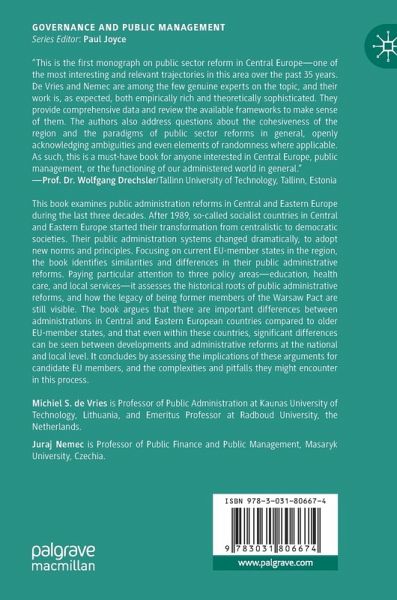 This book examines public administration reforms in Central and Eastern Europe during the last three decades. After 1989, so-called socialist countries in Central and Eastern Europe started their transformation from centralistic to democratic societies. Their public administration systems changed dramatically, to adopt new norms and principles. Focusing on current EU-member states in the region, the book identifies similarities and differences in their public administrative reforms. Paying particular attention to three policy areas - education, health care, and local services - it assesses the historical roots of public administrative reforms, and how the legacy of being former members of the Warsaw Pact are still visible. The book argues that there are important differences between administrations in Central and Eastern European countries compared to older EU-member states, and that even within these countries, significant differences can be seen between developments and administrative reforms at the national and local level. It concludes by assessing the implications of these arguments for candidate EU members, and the complexities and pitfalls they might encounter in this process.
