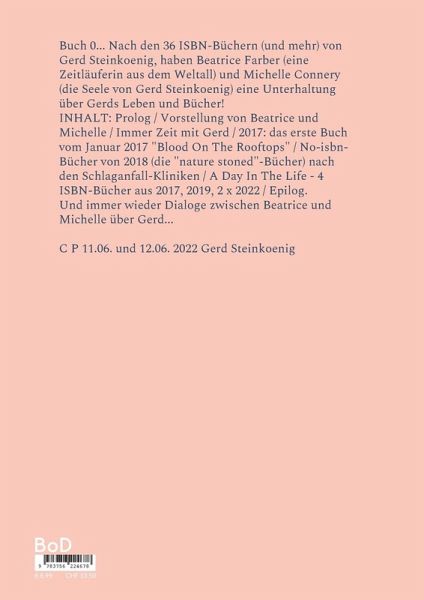 Buch 0... Nach den 36 ISBN-Büchern (und mehr) von Gerd Steinkoenig, haben Beatrice Farber (eine Zeitläuferin aus dem Weltall) und Michelle Connery (die Seele von Gerd Steinkoenig) eine Unterhaltung über Gerds Leben und Bücher! INHALT: Prolog / Vorstellung von Beatrice und Michelle / Immer Zeit mit Gerd / 2017: das erste Buch vom Januar 2017 "Blood On The Rooftops" / No-isbn-Bücher von 2018 (die "nature stoned"-Bücher) nach den Schlaganfall-Kliniken / A Day In The Life - 4 ISBN-Bücher aus 2017, 2019, 2 x 2022 / Epilog.Und immer wieder Dialoge zwischen Beatrice und Michelle über Gerd...C P 11.06. und 12.06. 2022 Gerd Steinkoenig
