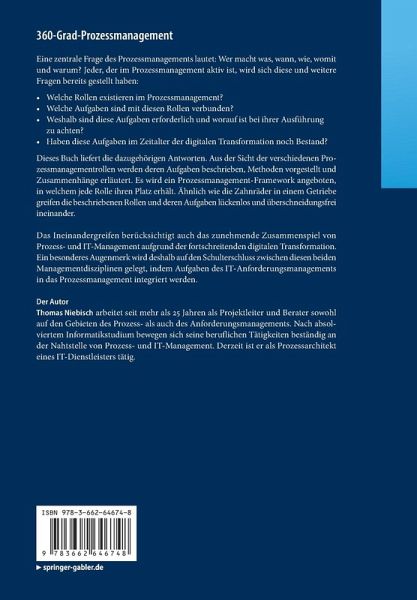 Aus der Sicht der verschiedenen Prozessmanagementrollen werden deren Aufgaben beschrieben, Methoden vorgestellt und Zusammenhänge erläutert. Es wird ein Prozessmanagement-Framework angeboten, in welchem jede Rolle ihren Platz erhält. Ähnlich wie die Zahnräder in einem Getriebe greifen die beschriebenen Rollen und deren Aufgaben lückenlos und überschneidungsfrei ineinander.