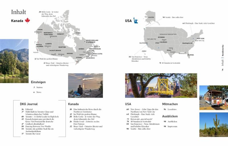 Die erste Ausgabe von 360° NordAmerika steht ganz im Zeichen der Küstenregion der kanadischen Provinz British Columbia, ein Hotspot für Naturfreunde: Jörg Michel nimmt uns mit in die dichten Regenwäldern und ihren Menschen, während Christian Heeb für Sie nach Haida Gwaii (bis 2009 offiziell Queen Charlotte Islands), der westlichsten Inselgruppe Kanadas, gereist ist. Das beeindruckende Bella Coola hat Ole Helmhausen erkundet - ein Ziel abseits der ausgetretenen Pfade. Außerdem stellen wir Ihnen den Bruce Trail vor, Ontarios ältesten und vielseitigsten Wanderweg. In den USA wiederum hat Sabine Loeprick einen erstaunlichen Wandel beobachtet: in Pittsburgh. Auf den Spuren der Kaffee-Kultur war Ralf Johnen rund um Seattle, der Heimat von Starbucks, unterwegs - und entdeckte viele kleinen Perlen für Kaffee-Genießer. Kultur und Natur standen in Arizona für Christian Dose bei "48 Stunden in Scottsdale" im Mittelpunkt. Und Jan de Jonge gibt Tipps, wie auch Reisende mit Beeinträchtigungen das Land der unbegrenzten Möglichkeit erleben können. Last but not least: Dank vieler neuer Attraktionen präsentiert sich San Francisco in völlig neuem Glanz: Wir bieten Ihnen zehn Empfehlungen für neue Attraktionen und beliebte Klassiker. Ebenfalls zehn Tipps für New Jersey, den Nachbarn von New York City, runden unser Angebot ab.
