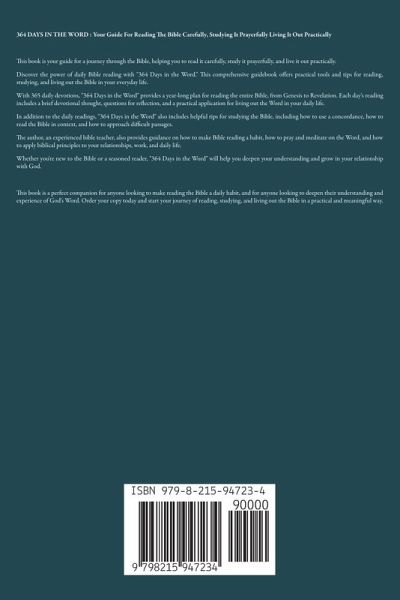 364 DAYS IN THE WORD : Your Guide For Reading The Bible Carefully, Studying It Prayerfully Living It Out Practically This book is your guide for a journey through the Bible, helping you to read it carefully, study it prayerfully, and live it out practically. Discover the power of daily Bible reading with "364 Days in the Word." This comprehensive guidebook offers practical tools and tips for reading, studying, and living out the Bible in your everyday life. With 365 daily devotions, "364 Days in the Word" provides a year-long plan for reading the entire Bible, from Genesis to Revelation. Each day's reading includes a brief devotional thought, questions for reflection, and a practical application for living out the Word in your daily life. In addition to the daily readings, "364 Days in the Word" also includes helpful tips for studying the Bible, including how to use a concordance, how to read the Bible in context, and how to approach difficult passages. The author, an experienced bible teacher, also provides guidance on how to make Bible reading a habit, how to pray and meditate on the Word, and how to apply biblical principles to your relationships, work, and daily life. Whether you're new to the Bible or a seasoned reader, "364 Days in the Word" will help you deepen your understanding and grow in your relationship with God. This book is a perfect companion for anyone looking to make reading the Bible a daily habit, and for anyone looking to deepen their understanding and experience of God's Word. Order your copy today and start your journey of reading, studying, and living out the Bible in a practical and meaningful way.