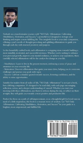 Dive into '365 Affirmations: Cultivating Mindfulness, Motivation, and Success,' a daily companion designed to guide you through a year of transformation. Each of the 365 affirmations is a beacon of inspiration, carefully crafted to foster positive thinking, self-awareness, and a proactive approach to life's challenges. This book not only offers a daily dose of motivation but also delves into the purpose and history of affirmations, illuminating how these powerful statements can rewire our thoughts and propel us towards our goals. With examples that resonate and inspire, you'll discover how to harness the energy of positive thinking to manifest success, cultivate mindfulness, and unlock your true potential. Begin any day of the year and embark on a journey to a more mindful, motivated, and successful you.