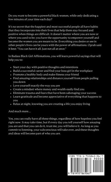 Do you want to become a powerful black women while only dedicating a few minutes of your time each day? It's no secret that the happiest and most successful people all have habits that they incorporate into their lives that help them stay focused and positive when things are difficult. It doesn't matter where you are now or where you used to be; you have the opportunity to empower yourself and become the women you are meant to be. Everything you desire or see in other people's lives can be yours with the power of affirmations. Oprah said it best "You can have it all. Just not all at once." In 365 Badass Black Girl Affirmations, you will learn powerful sayings that will help you to:Start your day with positive thoughts and intentions Build a successful career and find your boss girl in the workplace Promote a healthy body and make fitness your friend Find amazing relationships and distance yourself from people pulling you down Love yourself exactly the way you are Create a mindset where money and wealth easily find you Eliminate trauma and fears that have been sabotaging your success Learn gratitude and become appreciative of everything that happens to you Relax at night, knowing you are creating a life you enjoy living Plus two bonus sections: Affirmations I Tell My Children and Affirmations I Tell My Husband And much more!Yes, you can really have all these things, regardless of how hopeless you feel right now. It may take time, but if every day you tell yourself how amazing you are and that you can do it, trust me, you will believe it. As long as you commit to reading, your subconscious will take over, and these thoughts and ideas will become part of who you are. Are you ready to finally do something for yourself and change your life?