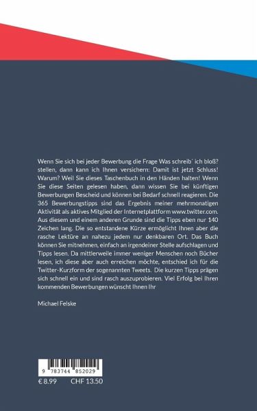 Wenn Sie sich bei jeder Bewerbung die Frage Was schreib´ ich bloß? stellen, dann kann ich Ihnen versichern: Damit ist jetzt Schluss! Warum? Weil Sie dieses Taschenbuch in den Händen halten! Wenn Sie diese Seiten gelesen haben, dann wissen Sie bei künftigen Bewerbungen Bescheid und können bei Bedarf schnell reagieren. Die 365 Bewerbungstipps sind das Ergebnis meiner mehrmonatigen Aktivität als aktives Mitglied der Internetplattform www.twitter.com. Aus diesem und einem anderen Grunde sind die Tipps eben nur 140 Zeichen lang. Die so entstandene Kürze ermöglicht Ihnen aber die rasche Lektüre an nahezu jedem nur denkbaren Ort. Das Buch können Sie mitnehmen, einfach an irgendeiner Stelle aufschlagen und Tipps lesen.Die 365 sind deshalb (nicht aus Faulheit) ungeordnet und nahezu völlig unsortiert. Alle, die immer die absolute Ordnung lieben, sind also gezwungen ein anderes Buch zu kaufen. Alle anderen können völlig frei entscheiden und auf die Spur gehen ihren Bewerbungsprozess und ihre Bewerbung entscheidend zu verbessern. Da mittlerweile immer weniger Menschen noch Bücher lesen, ich diese aber auch erreichen möchte, entschied ich für die Twitter-Kurzform der sogenannten Tweets. Nach einigen Versuchen Wichtiges auch in Kürze zu servieren, spürte ich, dass es funktioniert. Die kurzen Tipps prägen sich schnell ein und sind rasch auszuprobieren.Viel Erfolg bei Ihren kommenden Bewerbungen wünscht Ihnen IhrMichael Felske