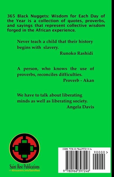 365 Black Nuggets: Wisdom for Each Day of the Year is a collection of quotes, proverbs, and sayings that represent a very small sample of the collective wisdom within the African experience. This book is meant to help the reader to become aware of and connect to the wisdom forged in the African experience, a wisdom and experience often overlooked, undervalued, or assumed not to exist. 365 Black Nuggets: Wisdom for Each Day of the Year is organized by month and date. Each day has a specific "nugget" of wisdom - each is an opportunity to reflect on a thought/idea/value rooted in African cultural heritage. 365 Black Nuggets of Wisdom has several of the "best" known quotations and many other powerful words. You will be moved to reflect, act, and grow. Whether you are looking for the perfect quote or wanting a thought of the day you have more than 365 quotes, sayings, and proverbs.