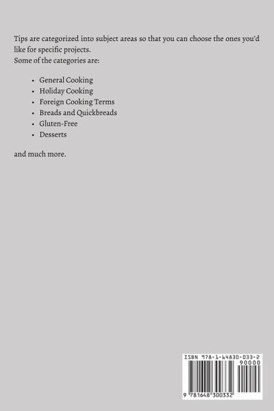 Tips are categorized into subject areas so that you can choose the ones you’d like for specific projects. Some of the categories are: General Cooking Holiday Cooking Foreign Cooking Terms Breads and Quickbreads Gluten-Free Desserts and much more.