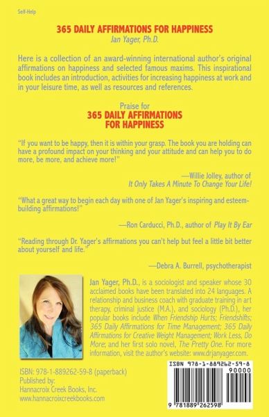This is a collection of the author's original inspirational affirmations plus two dozen selected famous maxims on happiness. This useful little book also includes an introduction about happiness, activities for increasing happiness at work and in your leisure time, as well as useful resources and references. "If you want to be happy, then it is within your grasp. The book you are holding can have a profound impact on your thinking and your attitude and can help you to do more, be more, and achieve more!"-Willie Jolley, author of It Only Takes A Minute To Change Your Life! About the author: Dr. Jan Yager is a sociologist, coach, and speaker who is the author of 30 books including Friendshifts; When Friendship Hurts; Friendship Journal; Road Signs on Life's Journey; 365 Daily Affirmations for Creative Weight Management; and 365 Daily Affirmations for Time Management, translated into 24 languages. She has been interviewed on major talk shows such as Oprah, the Today Show, Good Morning, America, and has been on several international author tours. For more on this award-winning author, visit her main website: www.drjanyager.com