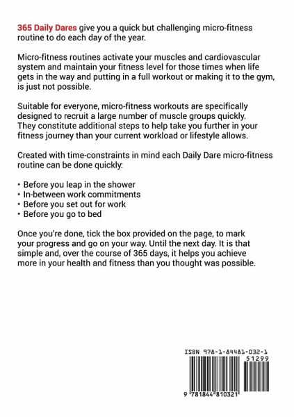 365 Daily Dares give you a quick but challenging Darebee micro-fitness routine to do each day of the year. Micro-fitness routines activate your muscles and cardiovascular system and maintain your fitness level for those times when life gets in the way and putting in a full workout or making it to the gym, is just not possible. Suitable for everyone, micro-fitness workouts are specifically designed to recruit a large number of muscle groups quickly. They constitute additional steps to help take you further in your fitness journey than your current workload or lifestyle allows. Created with…mehr
