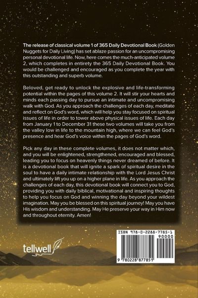 The release of classical volume 1 of 365 Daily Devotional Book (Golden Nuggets for Daily Living) has set ablaze passion for an uncompromising personal devotional life. Now, here comes the much-anticipated volume 2, which completes in entirety the 365 Daily Devotional Book. You would be challenged and encouraged as you complete the year with this outstanding and superb volume. Beloved, get ready to unlock the explosive and life-transforming potential within the pages of this volume 2. It will stir your hearts and minds each passing day to pursue an intimate and uncompromising walk with God. As you approach the challenges of each day, meditate and reflect on God's word, which will help you stay focused on spiritual issues of life in order to tower above physical issues of life. Each day from January 1 to December 31 these two volumes will take you from the valley low in life to the mountain high, where we can feel God's presence and hear God's voice within the pages of God's word. Pick any day in these complete volumes, it does not matter which, and you will be enlightened, strengthened, encouraged and blessed, leading you to focus on heavenly things never dreamed of before. It is a devotional book that will ignite a spark of spiritual desire in the soul to have a daily intimate relationship with the Lord Jesus Christ and ultimately lift you up on a higher plane in life. As you approach the challenges of each day, this devotional book will connect you to God, providing you with daily biblical, motivational and inspiring thoughts to help you focus on God and winning the day beyond your wildest imagination. May you be blessed on this spiritual journey! May you have His wisdom and understanding. May He preserve your way in Him now and throughout eternity. Amen!