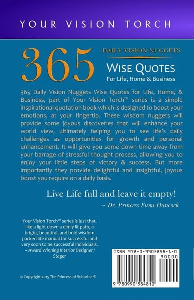 Your Vision Torch(TM) series is just that, like a light down a dimly lit path, a bright, beautiful, and bold wisdom packed life manual for successful and very soon to be successful individuals. I challenge anyone to read Your Vision Torch from cover to cover and be inspired! Truly this has impacted me, and I know many others, to achieve your dreams and goals not just for the sake of oneself, but also for us all! Thank You Dr. Princess Fumi Hancock, for all of the good you pour into others! -Award Winning Interior Designer/Stager 365 Daily Vision Nuggets Wise Quotes for Life, Home, & Business, part of Your Vision Torch(TM) series, is a simple inspirational quotation book, which is designed to boost your emotions, at your fingertip. These wisdom nuggets will provide some joyous discoveries that will enhance your worldview, ultimately helping you to see life's daily challenges as opportunities for growth and personal enhancement. It will give you some down time away from your barrage of stressful thought process, allowing you to enjoy your little steps of victory & success. They provide delightful and insightful boost you require on a daily basis. More importantly, these carefully thought out quotes are aimed at helping to put some unique perspective as well as tailor your emotions, regardless of where you are in life and where you believe you ought to be. Live Life full and leave it empty! -Dr. Princess Fumi S. Hancock, BSN, MA, DNP.