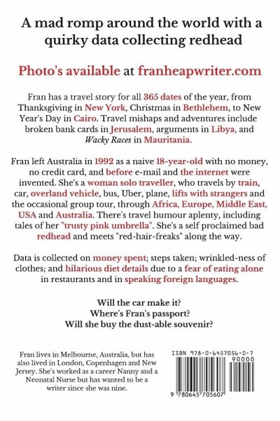 A mad romp around the world by a quirky data collecting redhead! A book for those who love Peter Moore. If you love Bill Bryson read this! Fran has a travel story for all 365 dates of the year, from Thanksgiving in New York, Christmas in Bethlehem, to New Year's Day in Cairo. Travel mishaps and adventures include broken bank cards in Jerusalem, arguments in Libya, and Wacky Races in Mauritania. Fran left Australia in 1992 as a naive 18-year-old with no money, no credit card, and before e-mail and the internet were invented. She's a woman traveler, often a solo traveler, who travels by train, car, overland vehicle, bus, Uber, plane, lifts with strangers and the occasional group tour, through Africa, Europe, Middle East, USA and Australia. There's travel humor aplenty, including tales of her "trusty pink umbrella". She's a self proclaimed bad redhead and meets "red-hair-freaks" along the way. Data is collected on money spent; steps taken; wrinkled-ness of clothes; and hilarious diet details due to a fear of eating alone in restaurants and in speaking foreign languages.