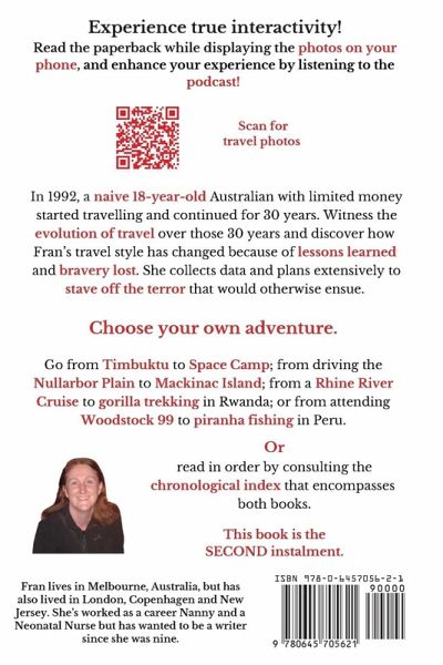 In 1992, a naive 18-year-old Australian with limited funds started a journey and continued for 30 years. Witness the evolution of travel and how Fran changed because of lessons learned and bravery lost. She collects data and extensively plans to ward off the overwhelming fear that would otherwise consume her. Go from Timbuktu to Space Camp; from driving the Nullarbor Plain to Mackinac Island; from a Rhine River Cruise to gorilla trekking in Rwanda; or Woodstock 99 to piranha fishing in Peru. Read the book with the photos on your phone, and listen to the podcast. This second instalment completes 365 travel stories, one for each date of the year.