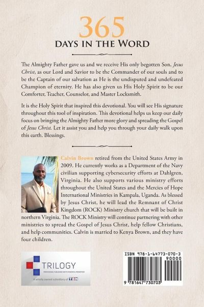 The Almighty Father gave us and we receive His only begotten Son, Jesus Christ, as our Lord and Savior to be the Commander of our souls and to be the Captain of our salvation as He is the undisputed and undefeated Champion of eternity. He has also given us His Holy Spirit to be our Comforter, Teacher, Counselor, and Master Locksmith. It is the Holy Spirit that inspired this devotional. You will see His signature throughout this tool of inspiration. This devotional helps us keep our daily focus on bringing the Almighty Father more glory and spreading the Gospel of Jesus Christ. Let it assist you and help you through your daily walk upon this earth. Blessings.