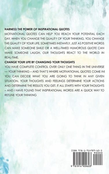 Harness the power of inspirational quotes Motivational quotes can help you reach your potential each day. When you change the quality of your thinking, you change the quality of your life, sometimes instantly. Just as positive words can make someone smile or a well-timed humorous quote can make someone laugh, our thoughts react to the world in real-time. Change your life by changing your thoughts You have complete control over only one thing in the universe - your thinking - and that's where motivational quotes come in! You can decide what you are going to think in any given situation. Your thoughts and feelings determine your actions and determine the results you get. It all starts with your thoughts - and I have found that inspirational words are a quick way to retune your thinking What are you waiting for? Grab your copy today