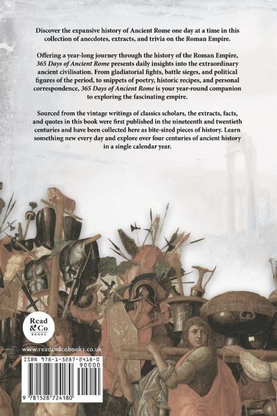 Discover the expansive history of Ancient Rome one day at a time in this collection of anecdotes, extracts, and trivia on the Roman Empire. Offering a year-long journey through the history of the Roman Empire, 365 Days of Ancient Rome presents daily insights into the extraordinary ancient civilisation. From gladiatorial fights, battle sieges, and political figures of the period, to snippets of poetry, historic recipes, and personal correspondence, 365 Days of Ancient Rome is your year-round companion to exploring the fascinating empire. Sourced from the vintage writings of classics scholars, the extracts, facts, and quotes in this book were first published in the nineteenth and twentieth centuries and have been collected here as bite-sized pieces of history. Learn something new every day and explore over four centuries of ancient history in a single calendar year.