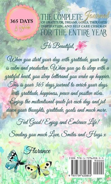 365 Days of Bliss: The Complete Journal of Gratitude, Dreams, Goals, Thoughts, Inspiration, and Self-Care Check-In for the Entire Year! Journaling is a beautiful experience, it is so satisfying and brings a sense of calm and relaxation. It helps you to think, imagine, plan, remember, rant, discover, dream, feel gratitude, relax, unwind and slow down. When practiced regularly, it can be transformational. When you start your day with gratitude, your day is calm and productive. When you go to sleep with a grateful heart, you sleep better and you wake up happier. This is your 365 Days Floral Journal to enrich your days with gratitude, happiness, peace, and positive vibes. Have you noticed, the world is slowly losing its color, it's all turning even monochrome. For some, life revolves around dark colors - mainly grey and black. Hence the thought behind creating this floral-themed journal with lots of subtle colors and vibes, bespoke to each month. Flowers and colors have the power to uplift our moods and brighten our days with positive vibes. With their colorful and beautiful blooms, flowers are often seen as symbols of delight and joy. This beautiful bespoke journal is designed with a unique floral theme for each month. Each page has a section for jotting down your goals, dreams, affirmation, thoughts, gratitude, and mood of the day alongside a carefully selected thought-provoking 'quote for the day'. Why Get This Journal? ¿ Floral-themed inside and outside. ¿ 366 pages to write - one for each day of the month. ¿ A bespoke subtle floral theme for each month ¿ Compact size - 5.5x8.5" journal to sit neatly on your bedside table or conveniently carry around in your handbag/purse/backpack. ¿ Perfect for ladies of all age groups who love flowers, gardens, and journaling. ¿ Ideal for bullet journaling. ¿ Perfect to write your dreams & goals, thoughts for the day, gratitude and affirmation which is a very powerful exercise in navigating towards your goals. ¿ A page on how to use this journal. Carefully selected affirmations for the day. Sections to add your goals and timelines, your answered prayers and much much more! ¿ The perfect gift to a much-loved lady!