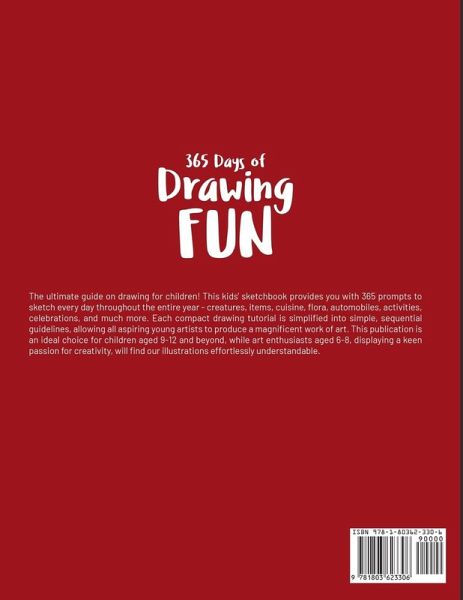 The ultimate guide on drawing for children! This kids' sketchbook provides you with 365 prompts to sketch every day throughout the entire year - creatures, items, cuisine, flora, automobiles, activities, celebrations, and much more. Each compact drawing tutorial is simplified into simple, sequential guidelines, allowing all aspiring young artists to produce a magnificent work of art. This publication is an ideal choice for children aged 9-12 and beyond, while art enthusiasts aged 6-8, displaying a keen passion for creativity, will find our illustrations effortlessly understandable.