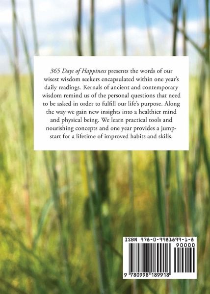 365 Days of Happiness A Lifetime of Joy provides the words of our wisest wisdom seekers encapsulated within one year's daily readings. Embark on a journey of learning how to live life happily and joyously. Kernals of ancient and contemporary wisdom remind us of the personal questions that need to be asked in order to fulfill our life's purpose. Along the way we gain new insights into a healthier mind and physical being. We learn practical tools and nourishing concepts and one year provides a jumpstart for a lifetime of improved habits and skills. The words along with the delightful photos are the exact guarantee that the ensuing hours of the day will be enhanced. Short phrases evoke powerful positive ideas to bolster the reader's spirit to happily overcome any stresses of ordinary daily life. Positive neural pathways replace negative thinking so one year of reflection turns into many years of continued use. Specific topics include hints to letting go, living in the moment, purpose fulfillment, nutritious food, healthy and simple living environments, restorative sleeping, and natural pet care.
