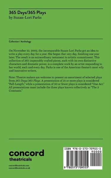 On November 13, 2002, the incomparable Suzan-Lori Parks got an idea to write a play every day for a year. She began that very day, finishing one year later. The result is an extraordinary testament to artistic commitment. This collection of 365 impeccably crafted pieces, each with its own distinctive characters and dramatic power, is a complete work by an artist responding to her world, each and every day. Parks is one of the American theater's most wily and innovative writers, and her "stark but poetic language and fiercely idiosyncratic images transform her work into something haunting and marvelous." (Time Magazine) Note: Theatre makers are welcome to present an assortment of selected plays from 365 Days/365 Plays. A presentation of 31 or more plays is considered "Full-Length," while a presentation of 30 or fewer plays is considered "One Act." All presentations must include the three plays known collectively as "The 3 Constants."
