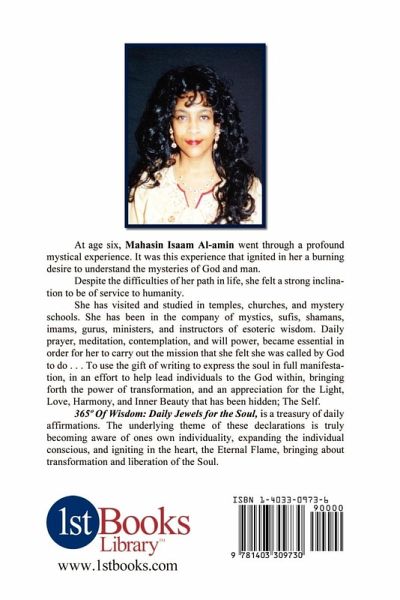 "365 º Of Wisdom" Daily Jewels For the Soul, is a beautiful treasury of inspirational revelations that were written for those who are willing to go on a spiritual journey to discover the Divine Self within; the "I Am." It is heart felt, thought provoking, and once read, transformation and spiritual unfoldment is endless.